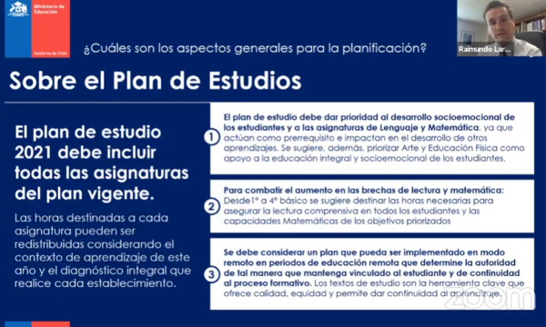 Más de 870 docentes, equipos directivos y apoderados se conectaron simultáneamente para participar del seminario online “Lineamientos para la planificación escolar 2021”, a cargo del jefe de la División de Educación General, Raimundo Larraín.