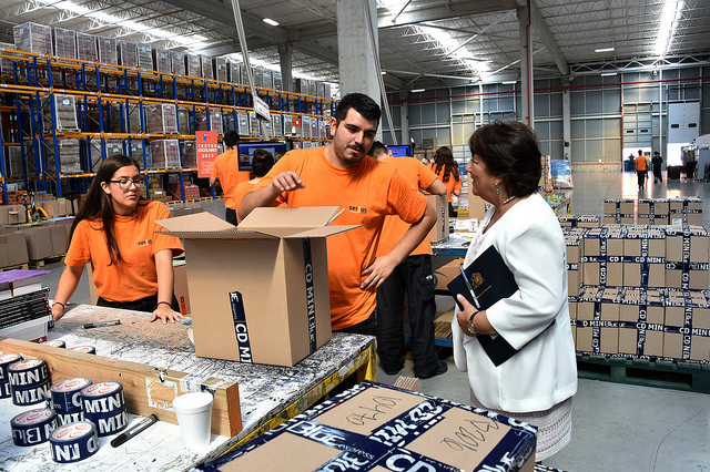 La Ministra de Educación Adriana Delpiano acompañó a la Presidenta de la República Michelle Bachelet a las bodegas de distribución de textos escolares del Mineduc en la comuna de Pudahuel.