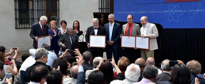 La mandataria concedió las distinciones acompañada por los ministros de Educación, Adriana Delpiano, y de Cultura, Ernesto Ottone, en las cinco categorías correspondientes al presente año: Ciencias Naturales, Ciencias Aplicadas y Tecnológicas, Historia, Literatura y Artes Musicales.