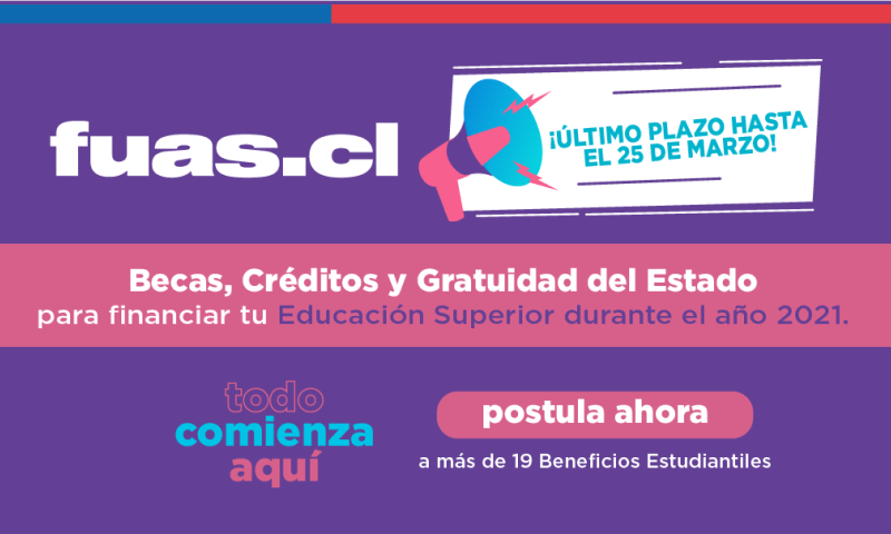 Hasta el próximo jueves 25 de marzo, a las 14:00 horas, estará abierto el formulario disponible en www.fuas.cl. “En el difícil contexto actual, hemos decidido ampliar el plazo para que todos los jóvenes que requieren apoyo del Estado puedan realizar su postulación a becas, créditos y gratuidad”, enfatizó el Subsecretario de Educación Superior, Juan Eduardo Vargas.