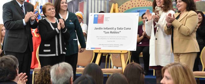 La Presidenta de la República, Michelle Bachelet, acompañada por la subsecretaria de Educación Parvularia, María Isabel Díaz, inauguró este miércoles la sala cuna y jardín infantil “Los Robles”, en la comuna de Puente Alto. Durante la actividad también estuvieron presentes la vicepresidenta de la Junta Nacional de Jardines Infantiles (Junji), Desirée López de Maturana, y el alcalde de la comuna de Puente Alto, Germán Codina.